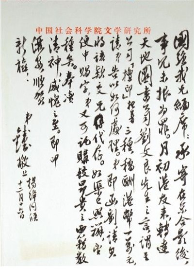 上圖釋文 錢鐘書一九八年十二月十六日致李國強(qiáng) 國強(qiáng)我兄編席:承寄在京合影后,事冗未報(bào)為罪。月初港友來,轉(zhuǎn)達(dá)天地圖書公司劉文良先生之言,謂其公司“擅印”拙著三種,稿酬港幣一萬元,請(qǐng)弟告以如何處理。弟即函劉,請(qǐng)其收該款交兄代存。如渠已照辦,望便中賜字,弟又可購較昂貴之西籍?dāng)?shù)種矣。奉瀆清神,感愧之至。即叩 儷安,順賀 新禧!弟錢鍾