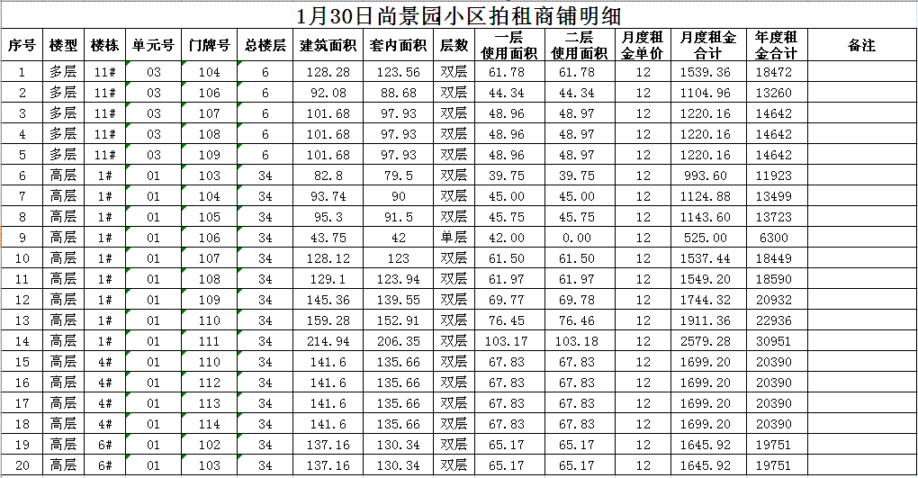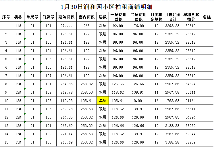 拍租門面房共有數(shù)十套,均為空房,房屋面積分別為數(shù)十至數(shù)百平方米不等。租賃期限均為3年。