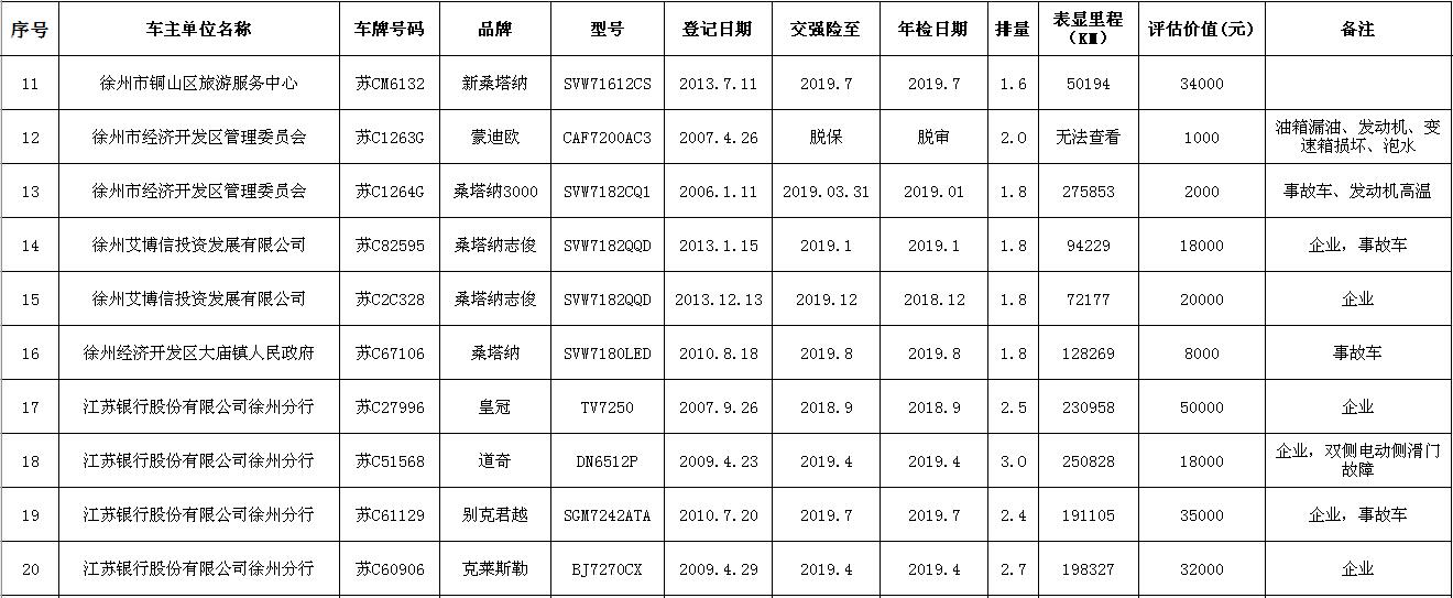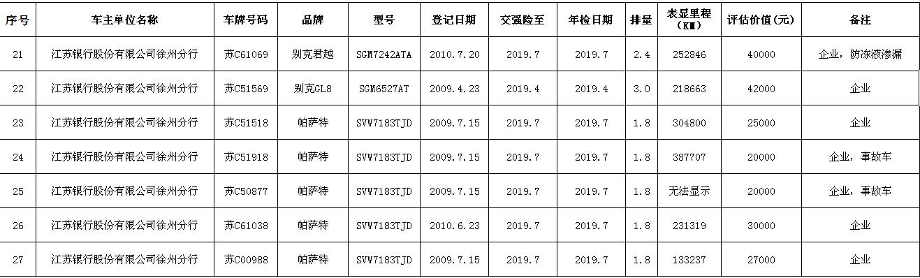 關(guān)注微信公眾號我公司受委托,定于2018年9月14日10時在中山南路55號三樓本公司拍賣廳公開拍賣:江蘇銀行股份有限公司徐州分行、徐州經(jīng)濟技術(shù)開發(fā)區(qū)、銅山區(qū)、云龍區(qū)公務車輛二十余輛。主要車型有帕薩特、皇冠、道奇、別克、克萊斯勒等。