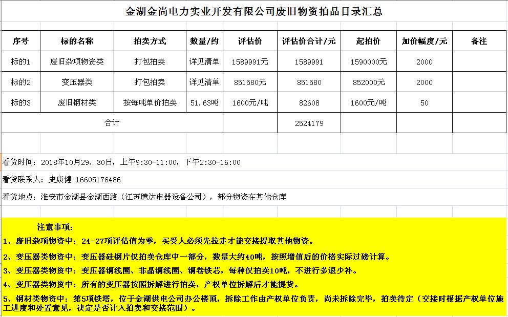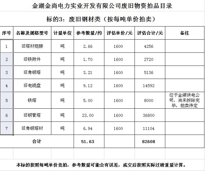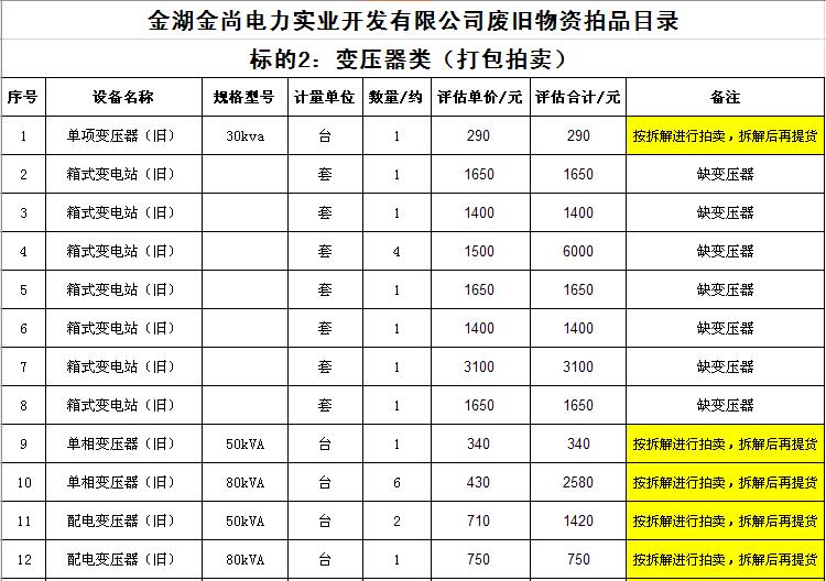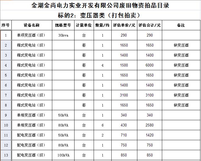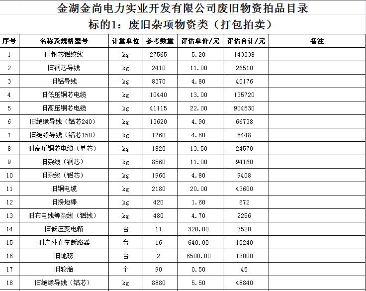 關注微信公眾號受金湖金尚電力實業(yè)開發(fā)有限公司委托,我公司將通過中國拍賣行業(yè)協(xié)會網(wǎng)絡拍賣平臺以網(wǎng)絡競價的方式公開拍賣廢舊物資一批,主要包括:電纜、導線、鋼芯鋁絞線、角鋼塔、鐵附件、金具、變壓器、箱式變電站、空調(diào)、電腦等(詳見拍品目錄)。