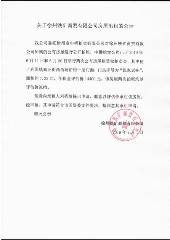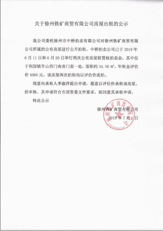 關于徐州鐵礦商貿(mào)有限公司房屋出租的公示