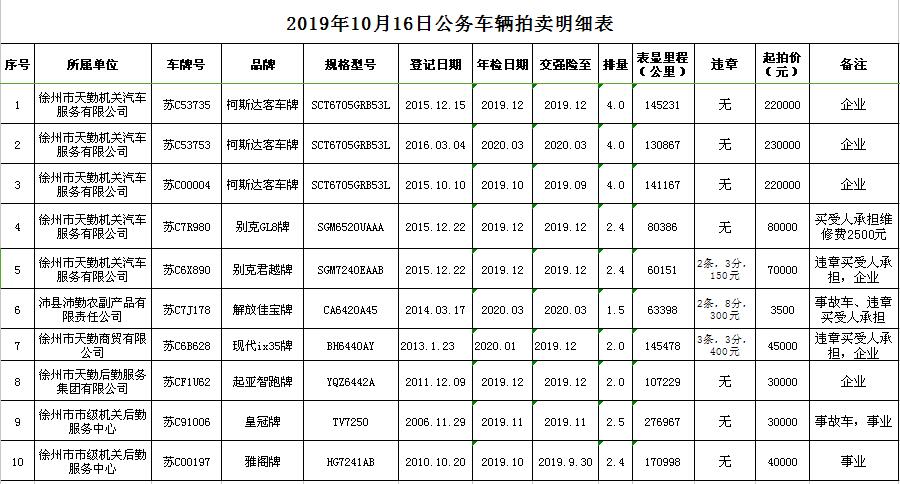 關(guān)注微信公眾號(hào)受委托,我公司定于2019年10月16日13:00時(shí)在徐州市銀地二手車交易市場(chǎng)四樓東南拍賣大廳通過(guò)現(xiàn)場(chǎng)和汽車街網(wǎng)絡(luò)拍賣平臺(tái)同步進(jìn)行的方式公開(kāi)拍賣以下公務(wù)車輛: