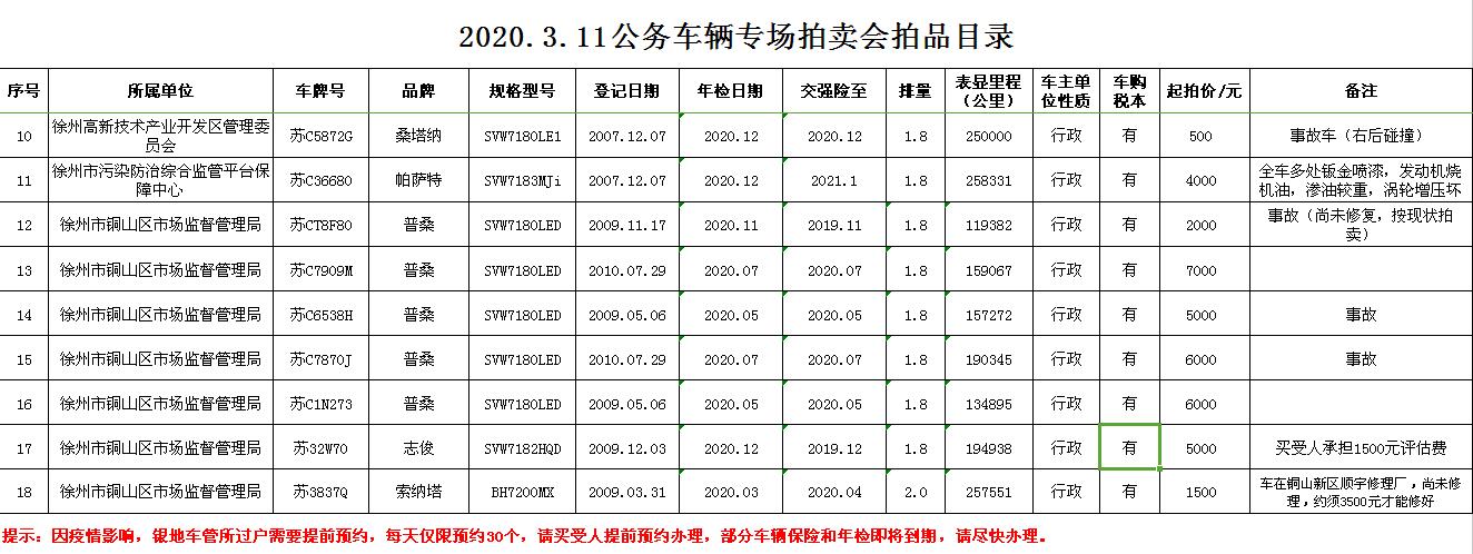 受委托,我公司定于2020年3月11日13:00時(shí)在徐州市銀地二手車交易市場四樓東南拍賣大廳通過現(xiàn)場和汽車街網(wǎng)絡(luò)拍賣平臺(tái)同步進(jìn)行的方式公開拍賣以下公務(wù)車輛: