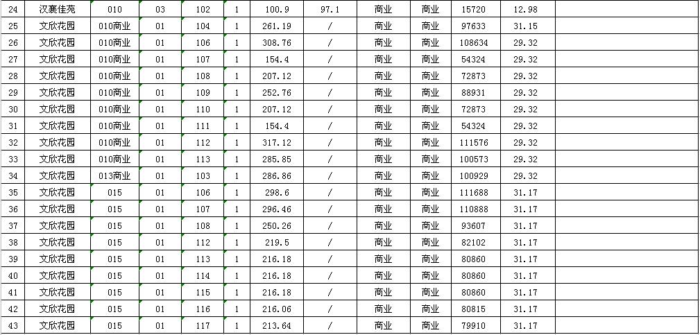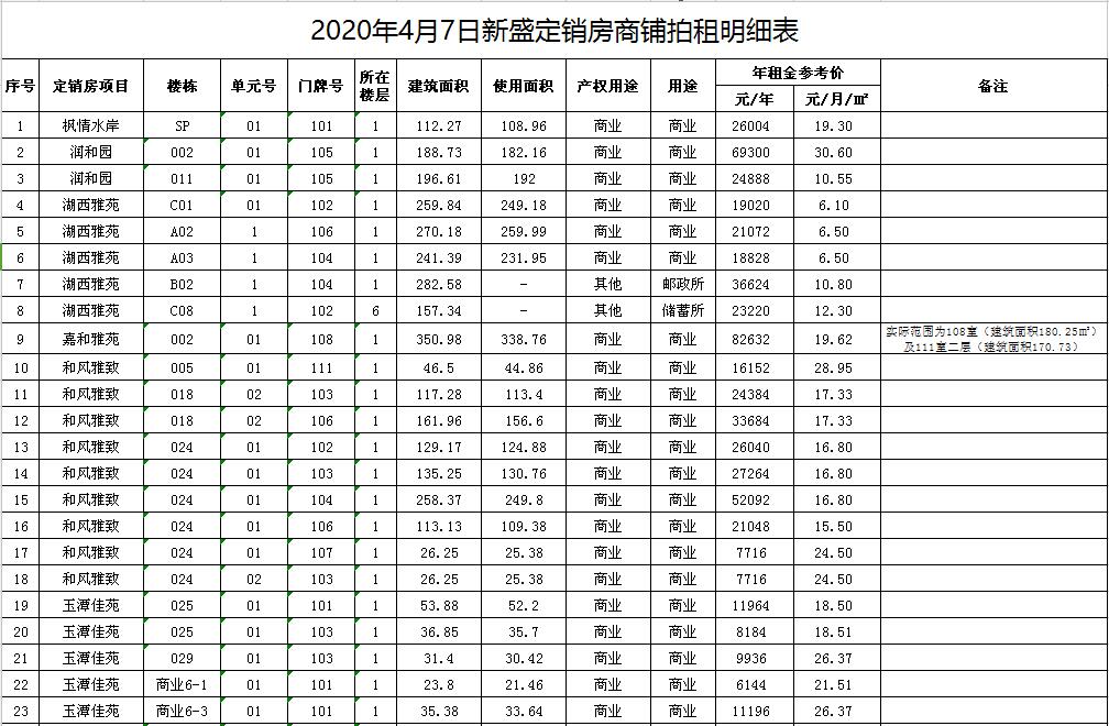 楓情水岸、潤和園、湖西雅苑、嘉和雅苑、和風雅致、玉潭佳苑、文欣花園等。拍租商鋪約43套,均為空房,面積分別為數十至數百平米不等。租期3年。