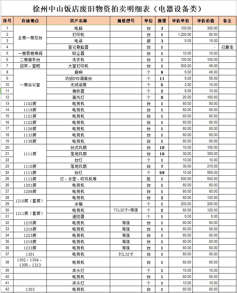 關(guān)注微信公眾號(hào)我公司受委托,定于2021年1月18日10時(shí)在中拍平臺(tái)通過(guò)網(wǎng)絡(luò)競(jìng)拍方式公開(kāi)拍賣:徐州市中山飯店、漢元商貿(mào)公司廢舊物資一批,主要包括廢舊電器設(shè)備、酒店用具等。