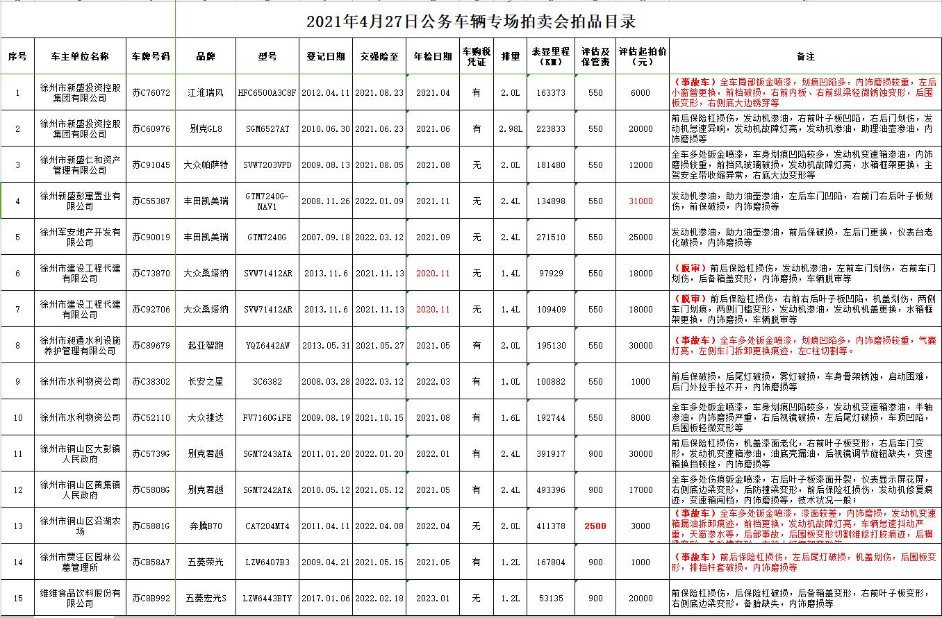 4月22日、23日在徐州中山飯店停車(chē)場(chǎng)及徐州銀地二手車(chē)交易市場(chǎng)展示。有意競(jìng)買(mǎi)者請(qǐng)持有效證件到我公司辦理報(bào)名手續(xù),并交納每輛車(chē)1萬(wàn)元保證金即可參拍,報(bào)名截止至4月26日16時(shí)。