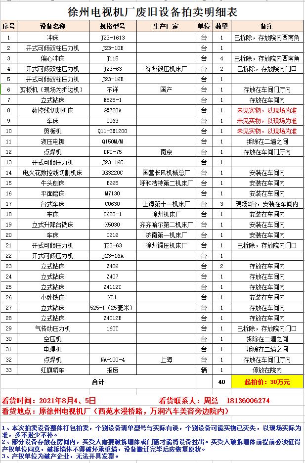 關(guān)注微信公眾號(hào)我公司受委托,定于2021年8月6日上午10時(shí)(延時(shí)除外)在中拍平臺(tái)公開拍賣:徐州電視機(jī)廠廢舊設(shè)備一批。主要包含:沖床、壓力機(jī)、折邊機(jī)、鉆床、機(jī)床、車床、刨床、磨床、銑床等、空壓機(jī)、電焊機(jī)等。